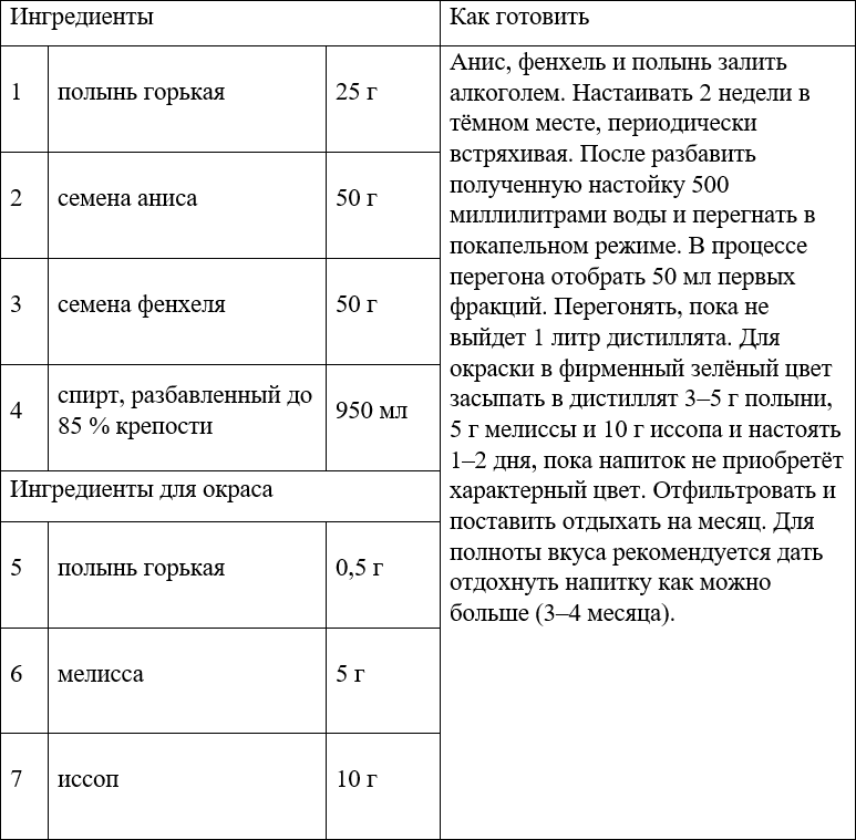 Абсент – алкогольный напиток на основе экстракта горькой полыни. Также он известен как «зелёная фея» или «зелёный змей», что связано с тем, что напиток имеет изумрудно-зелёный цвет. Первые упоминания об абсенте относятся к Древнему Египту, примерно к 1500 г до н. э. История возникновения этого напитка в его современном виде начинается в Швейцарии. Здесь представлен классический рецепт абсента.