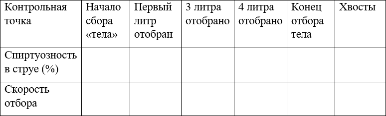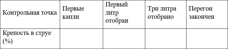 Производим замеры крепости. Замеряем крепость и скорость отбора по контрольным точкам таблицы и заполняем. Скорость можно вычислить так: подставляем мерный цилиндр и засекаем минуту на секундомере. Количество дистиллята умножаем на 60 и получаем скорость отбора.