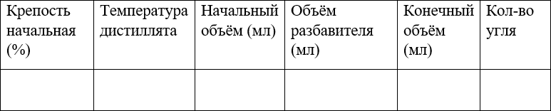 Рассчитываем и получаем количество воды, которое необходимо внести в наш дистиллят для получения крепости 20 %. Спиртовой раствор такой крепости лучше поддаётся очистке. Дело в том, что молекулы спирта при большей концентрации слабо отдают вредные примеси. Такая крепость рекомендована для углевания и второй перегонки.