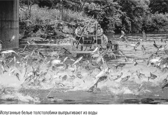 Самая примечательная особенность белого толстолобика – буквально бросающаяся в глаза – это его прыжки. Прыгать карпа заставляет в том числе гул лодочного мотора, поэтому катание на водных лыжах в кишащих карпом районах Среднего Запада стало отдельным видом экстремального спорта. Вид летящего по дуге толстолобика одновременно вызывает восхищение – ты как будто пришел на рыбий балет – и ужас – в тебя словно летит снаряд. Один рыбак в Оттаве рассказывал, что потерял сознание от столкновения с летящим карпом. Другой отметил, что давно не ведет счет травмам от ударов, потому что «карпы врезаются в тебя чуть ли не каждый день». Я читала историю о женщине[33], которая была сбита карпом с гидроцикла и выжила только потому, что проплывающий мимо лодочник заметил ее спасательный жилет, качающийся на воде. Бесчисленные ролики в YouTube с прыжками карпов носят названия вроде «Азиатский карпокалипсис» и «Атака прыгающего азиатского карпа». Жители города Бат (штат Иллинойс), расположенного на особенно богатом карпами участке реки, даже попытались нажиться на этом хаосе и проводят ежегодный «деревенский рыболовный турнир», участникам которого рекомендуется приходить в специальных костюмах. «Настоятельно рекомендуем использовать защитное снаряжение!» – советует сайт турнира.