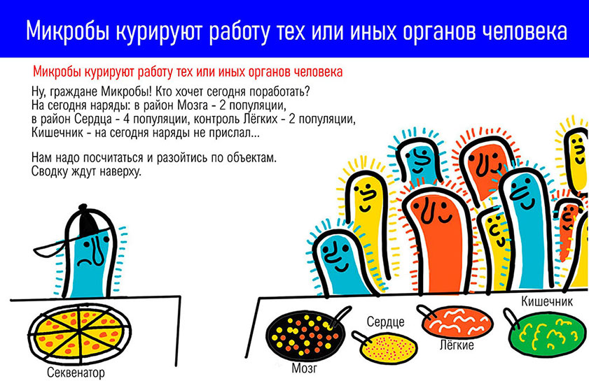 Сегодня уже очевидно, что микроорганизмы, живущие в симбиозе с человеком, выполняют следующие функции и курируют работу органов человека: