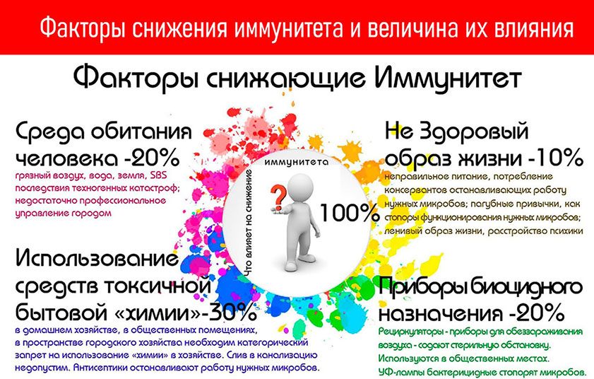1) ваша персональная инициатива: вредные привычки, ленивый образ жизни, неправильное питание, ваше нежелание помочь себе. Степень угнетения иммунитета = 10%