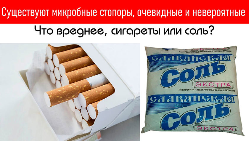 Сравнение стопоров микробной активности. Всем обществом мы осуждаем курение сигарет. Настолько осуждаем, что размещаем на пачках сигарет зловещие фотографии с изображениями загнивающих органов человека. Цель понятна – напугать курильщика, и побудить его бросить пагубную привычку. Короче, сигареты – это вредная привычка и обложена запретами, утверждёнными Государственной Думой. Но по сути сигареты являются лишь стопором микробной активности: при курении микробы, работающие в трахее, в бронхах, в лёгких тормозят свою активность. И нормальная работа дыхательной системы нарушается. Весь вред от сигарет заключён в этом замедлении работы микробов. Это очевидно, это известно всем. А теперь вопрос: что вреднее сигареты или поваренная пищевая соль? Причём, заинтересованные производители сигарет и соли могут не участвовать в опросе. Большинство людей скажет: сигареты вреднее, чем соль. А теперь я сообщу вам невероятное: соль для организма (особенно для почек) является сильнейшим стопором микробной активности. Соль NaCl вообще известна как сильнейший консервант микробов. Вспомните хотя бы солёную рыбу, солёные огурцы, солёное мясо или сало. Издавна разные народы использовали NaCl-хлористый натрий в качестве консерванта пищи. А для нас, микробных исследователей, соль является очередным стопором микробной активности. Так вот, к вашему сведению, соль в 10 раз вреднее, чем сигареты. «Невероятно!» – скажете вы. Почему тогда на пачках соли общество не рисует страшные картинки загнивающей плоти человека?