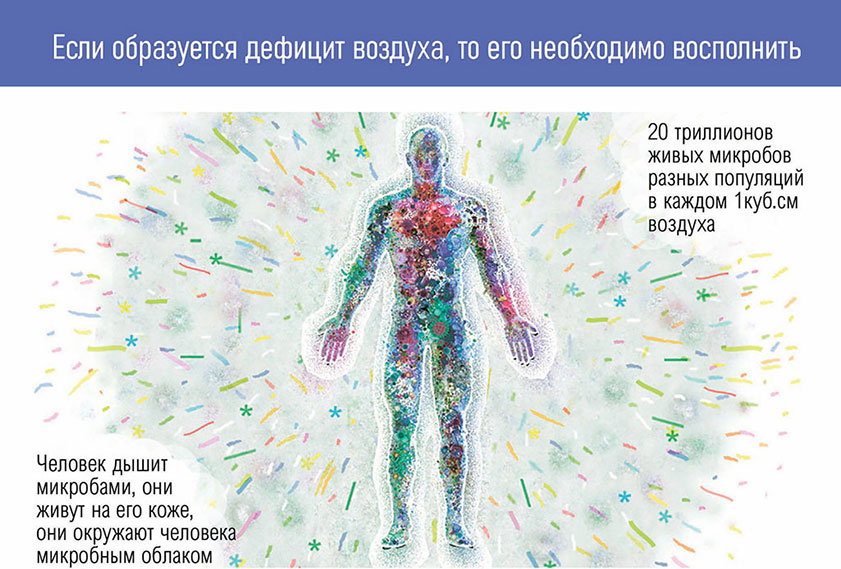 При вдохе организм человека получает очередную порцию живых микробов, которые вносят в организм человека добавочную порцию энергии. Стоит хоть на несколько минут перекрыть поступление воздуха с микробами в организм человека (удушье) и человеческий организм остановится. Это известно всем. То же самое происходит при поступлении в организм воды. Вода вносит в кишечник человека не только удивительное соединение H2O, но также и множество нужных живых микробов. Лишённая микробов вода нашему организму не нужна, она для человека будет «мёртвой» водой и смысла в ней нет. Вернёмся к воздуху.