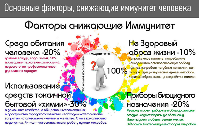 Насколько стопоры влияют на остановку работы микробиома и тем самым влияют на снижение иммунитета? Это всё, что должно нас интересовать в несоблюдении Здорового Образа Жизни. Хорошо это или плохо, когда микробы останавливают своё активное движение? Об этом мы узнаем дальше, и вы откроете для себя много интересного. В любом случае недостаточно здоровый образ жизни лишь частично угнетает наш иммунитет. И величину такого угнетения можно оценивать как 10 % от общего угнетения иммунитета. Что ещё угнетает работу нашего микробиома и снижает иммунитет?