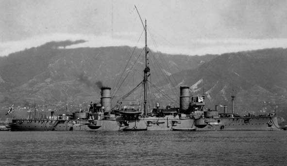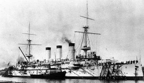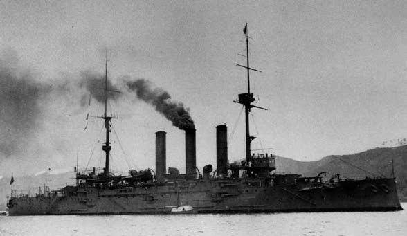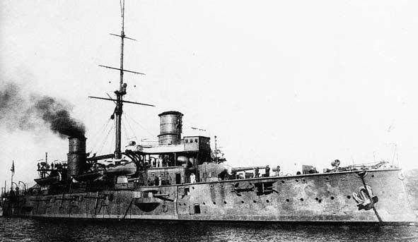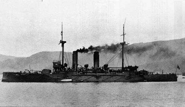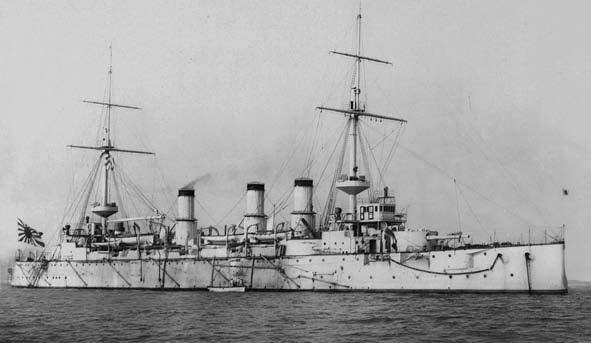 Броненосный крейсер «Якумо». Его средний калибр составляли 12 орудий калибром в 152 мм. Броня – крупповская. Скорость на испытаниях – 20,5 узлов, но в реальных боевых условиях развивал не более 19. Несмотря на чуть меньшее водоизмещение в сравнении с построенными в Англии аналогами (9 650 / 10 290 т.), обладал дальностью плавания в 5 000 миль (на 11,5 узлах).