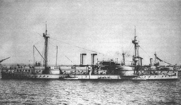 Броненосный крейсер «Касуга». Водоизмещение – 8 170 т. (стандартное). Скорость – 20 узлов (фактически с трудом развивал 18). Дальность плавания – 5 500 миль (на 10 узлах). Максимальная толщина крупповской брони – 150 мм. Основное артиллерийское вооружение: 1 орудие калибром 254 мм (в носовой башне), 2 орудия калибром 203 мм (в кормовой башне) и 14 орудий калибром 152 мм. Мореходность ещё хуже, чем у «Адзумы».