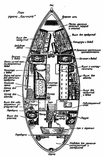 Грота-гик в качестве временной мачты прикреплен к уцелевшей части грот-мачты. Сломанная часть ее принайтовлена к палубе и выдается за борт: я рассчитывал поставить ее на место в Самоа, куда мне так и не удалось попасть. Бушприт сломан в нескольких футах от основания. Передняя часть рубки разрушена. Стекла каютных иллюминаторов левого борта разбиты, а правого остались невредимыми. Поручини снесены. Самодельные гаруса выкроены из бывшего грота. Весло установлено на корме вместо бизань-мачты. Предполагаемая скорость яхты – один узел