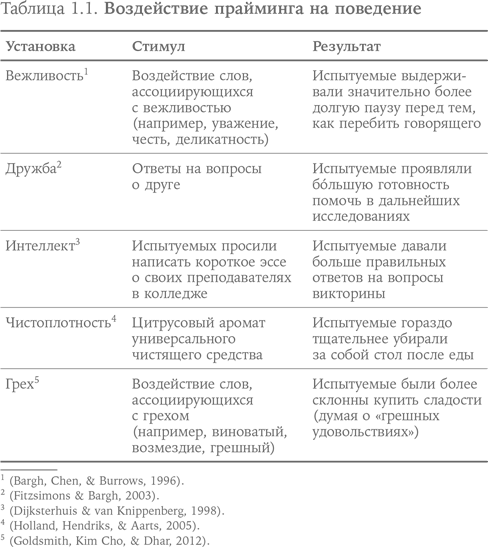 Помните, как слова, которые ассоциируются со старостью, запускали соответствующую схему и заставляли людей медленнее двигаться? Дальнейшие исследования показали, что прайминг может вызывать самые разные поведенческие реакции. Чтобы убедиться в огромном потенциале прайминга, взгляните на таблицу 1.1, где перечислены некоторые интересные находки ученых.