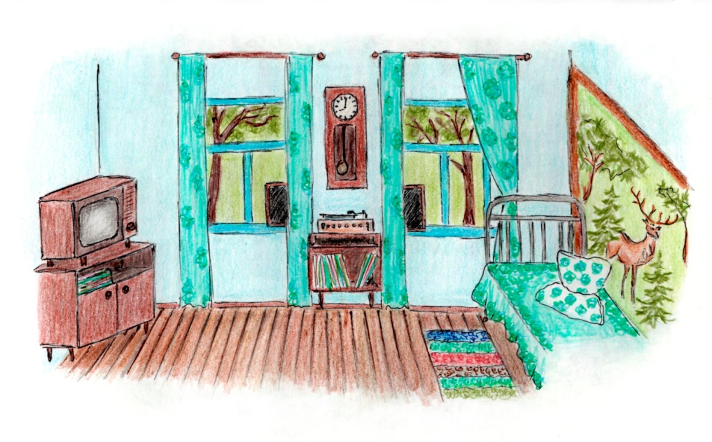 В зале на стене между двух окошек висят большие часы с боем, а под ними стоит проигрыватель на тумбочке. В ней стопка пластинок с разными песнями и моими сказками. На телевизоре красуется большая салфетка с цветами, вышитая бабушкой. Ее надо откинуть наверх, если хочешь посмотреть мультик или «В гостях у сказки».