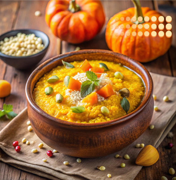 – В средней кастрюле соедините пшенку, нарезанную тыкву, кокосовые сливки, специи (карри, куркума, кумин) и соль (1 ст. л. кокосовых сливок отложите для обогащения эфирами!)