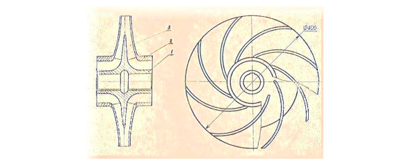 Рабочее колесо состоит из отдельных составных частей: ступицы (ведущего диска) 1, двух покрывных дисков 2 и лопастей 3. Для соединения лопастей 3 с покрывными дисками 2, в последних предусмотрены замкнутые фасонные прорези, через которые обеспечивается доступ к торцам лопастей для их приварки к покрывным дискам ручной электросваркой.