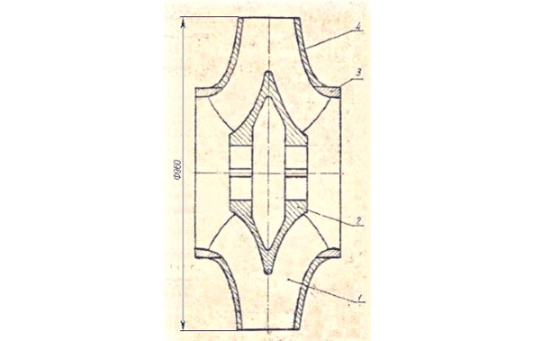 В 1973 – 78 г.г. разработка конструкции и технологии изготовления сварных рабочих колёс для центробежного насоса двустороннего входа выполнялась трестом «Узоргтехстроймелиорация»* ММиВХ УзССР и институтом «СредАзВНИИГидромаш»*. По рекомендации Управления по эксплуатации насосных станций Узмиводзоза в качестве аналога было принято цельнолитое чугунное рабочее колесо насоса 6НДв (поз. 11, рис. 1.25).