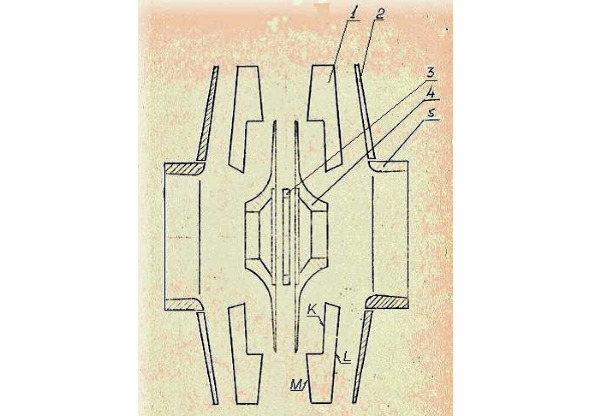 В отличие от ранее разработанной конструкции сварно-литого рабочего колеса для насоса 6НДв, в сварно-литом рабочем колесе насоса 24НДс входная горловина 3 отделена от покрывного диска 4, что обеспечило доступ для ручной приварки лопастей к ступице 2 и к горловине 3 с последующей приваркой к покрывным дискам 4.