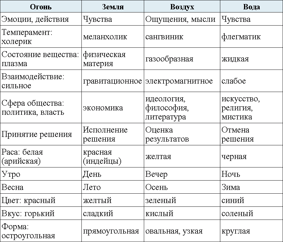 Заметим, что различные процессы и системы состоят из четырех основных элементов. В природе существуют четыре типа взаимодействия; только четыре элементарные частицы необходимы для существования обычного вещества. У человека четыре группы крови, четыре типа мозга, четыре типа темперамента, четыре основных системы (нервная, кровеносная, лимфатическая, опорно-двигательная), а в ДНК – четыре нуклеотида. У растения четыре части – корень, стебель, лист и плод. Год делится на четыре сезона, а сутки – на четыре части. Человечество представлено четырьмя расами. Многие события в обществе (выборы, спортивные соревнования) проводятся раз в четыре года. Таким образом, можно предположить, что объективно существуют четыре типа энергии, которые и связаны с остальными четырьмя типами на материальном уровне: