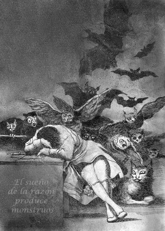 «На следующую ночь к нему [Гойя] опять явились все призраки, какие он перевидал за свою богатую видениями жизнь. У них были кошачьи и собачьи морды, они пялили на него огромные свиные глаза, протягивали гигантские когти, размахивали громадными крыльями нетопыри» [11. С. 340].