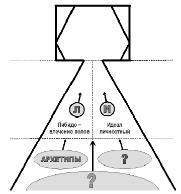 Сначала мы рассмотрели, как на основе идеи спонтанной организации возникла концепция «бессознательного». Исходя из трех принципов причинности как критериев трактовки сферы «бессознательного» психического, мы выделили три Силы и изобразили их на схеме «сцена-подвал»: Л – Либидо (Фрейд), «И» – «Личностный идеал» (Адлер) и Архетип (Юнг).