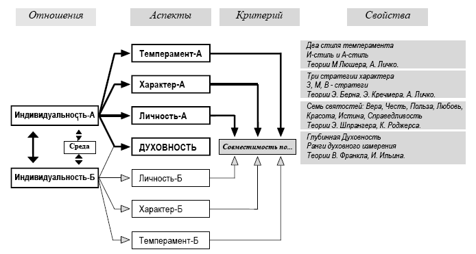 Структура индивидуальности изображена на рис. 36. Схема состоит из четырех «вертикалей»: Отношения, Аспекты, Критерий и Свойства.