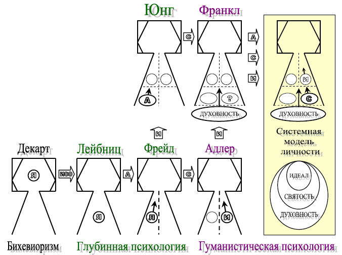 Системная модель личности (на рис. 44, справа вверху). Личность – это духовная индивидуальность человека. На модельной схеме личности «Ядро» душевного мира (на схеме «С» – Святость) находится в духовной сфере «коллективного бессознательного» (справа от пунктирной линии) и включено по принципу содействия в системную иерархию: «Личностный идеал» – Святость – Духовность (на рис. 44, справа внизу).