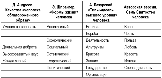 Варианты описания типов личности приведены в таблице. В первой колонке таблицы перечисляются основные качества «человека облагороженного образа», предложенные Д. Андреевым [2. С. 224]. Во второй – шесть «форм жизни» или типов личности, предложенные Э. Шпрангером [6. С. 71–82]. В третьей – восемь «типов-идеалов высшего уровня» развития человека, предложенные А. Ф. Лазурским [8. С. 192]. Завершает этот ряд авторская версия типологии личности.