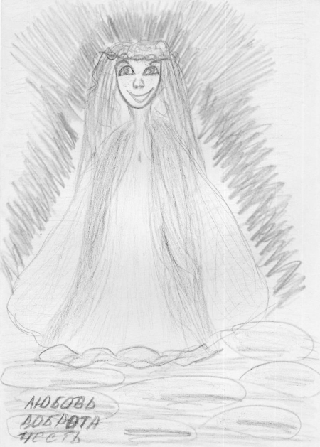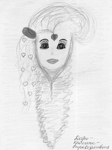 Самоанализ: «Я думаю, что в раннем детстве более значим внутренний мир человека: внешняя привлекательность не так важна, как внутренняя Доброта и Красота. С возрастом же, я считаю, человек с красивым внутренним миром должен быть и внешне красив. Когда я рисовала рисунок, я хотела выразить в облике человека не только его внутреннюю Доброту. Я постаралась изобразить его так, чтобы внутренняя Доброта воплотилась во внешнюю привлекательность и Красоту. Я считаю, что совершенство человека заключается в гармонии внутренней Доброты и внешней Красоты».