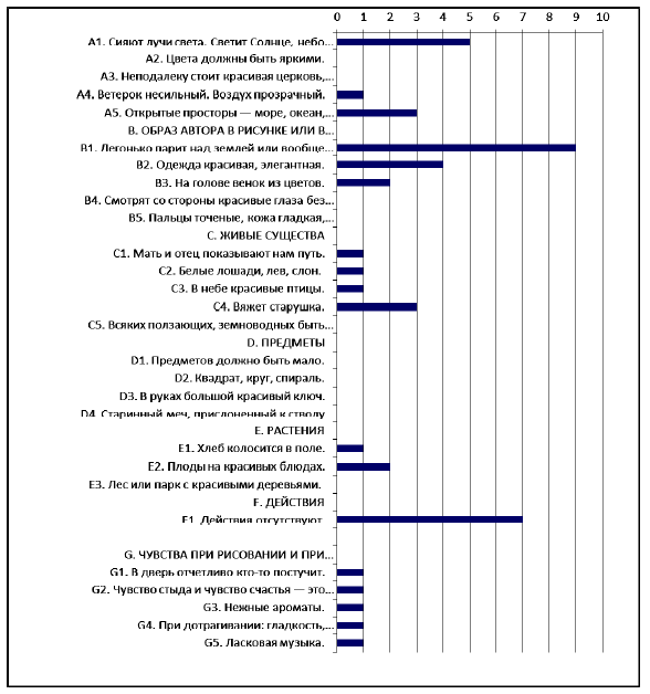 Рис. 63. Частота присутствия признаков «счастливых снов» в описании приятных снов студентов в тесте «Человек одухотворенного облика»