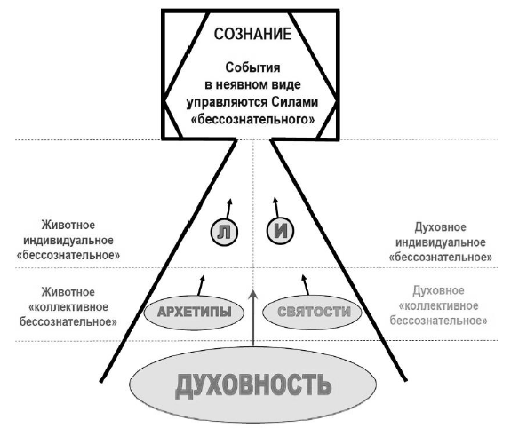 Рис. 65. Принципиальная схема душевного мира человека. Слева – эволюционно старые Силы: «Л» – Либидо и Архетипы. Справа – эволюционно новые Силы: «И» – личностный идеал с Святости из области «Духовного “коллективного бессознательного”». Духовность – времени и пространства