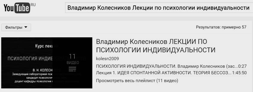 Плейлист этих лекций можно посмотреть по ссылке, если зайдете на www.youtube.com, наберете в поисковой строке «Владимир Колесников Лекции по психологии индивидуальности» и в первой же ссылке (рис. 66) будет надпись «Просмотреть весь плейлист (11 видео)». Кликните на эту ссылку и можно начинать просмотр.