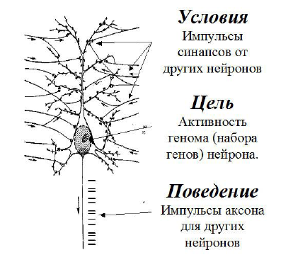 Цель жизни нейрона- это реализация его индивидуальной генетической программы, хранящейся в его геноме, если условия дозволяют. Поведение нейрона – это электрическая активность, исходящая из одного единственного аксона и посылаемая другим нейронам. Условие жизни нейрона- это синаптический приток электрохимических импульсов от других нейронов, попадающих на его тело через синапсы (рис. 9).