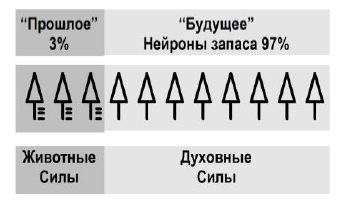 2. Существует огромное количество (97 %) «нейронов запаса». Эволюционный смысл этих нейронов с точки зрения прошлого опыта непонятен, поэтому «нейроны запаса» являются нейронами «будущего» (рис. 19).