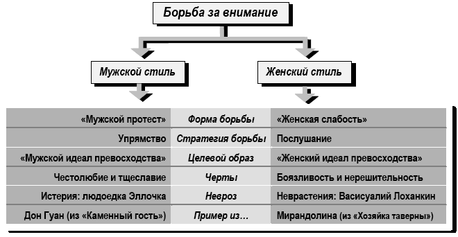 Развивая концепцию борьбы за внимание, Адлер выделил два стиля этой борьбы: мужской и женский (рис. 21). Эти стили как раз и задавались внутренним «Личностным идеалом». А невроз, согласно Адлеру, возникал из-за неадекватности стиля: мужской стиль у женщин порождал истерию (людоедка Эллочка из романа «Двенадцать стульев»), женский стиль у мужчин порождал неврастению (Васисуалий Лоханкин из романа «Золотой теленок»). Как известно, Эллочка стремилась к власти над мужчинами методом кройки привлекательной одежды, а Васисуалий Лоханкин, вызывая сострадание, держал власть над Варварой.