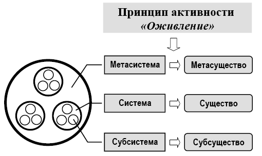 То, что человек включен в метасистемы и состоит из субсистем – достаточно понятно [12. С. 408]. Но для реализации принципа иерархичности следует осуществить процедуру «оживления», т. е. показать, что Метасистемы и Субсистемы удовлетворяют принципу активности и, как следствие, принципу саморазвития. Следовательно, они являются живыми, соответственно Метасуществами и Субсуществами. На рис. 25 «процедура оживления» символически изображена стрелой «У», исходящей от принципа активности.