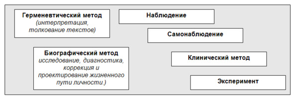 Авторы сводят число основных психологических методов к шести: 1) герменевтический, соответствующий такому состоянию науки, когда субъект и объект не противопоставлены, мысленная операция и метод науки тождественны; 2) биографический, предполагающий выделение целостного объекта познания в науке о психике; 3) наблюдение, в котором дифференцируются объект и субъект познания; 4) самонаблюдение, при котором происходит превращение субъекта в объект на основе предшествующей дифференциации; 5) клинический, когда ставится задача перехода от внешне наблюдаемого к внутренним механизмам; 6) эксперимент, предполагающий активное противостояние субъекта познания объекту, при котором учитывается роль субъекта в процессе познания.