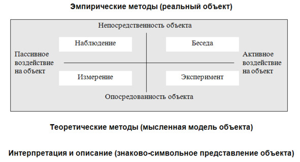 В. Н. Дружинин выделил три класса методов: 1) эмпирические, при которых осуществляется внешнее реальное взаимодействие субъекта и объекта исследования; 2) теоретические, при которых субъект взаимодействует с мысленной моделью объекта (предметом исследования); 3) интерпретации и описания, при которых субъект «внешне» взаимодействует со знаково-символическими представлениями объекта.