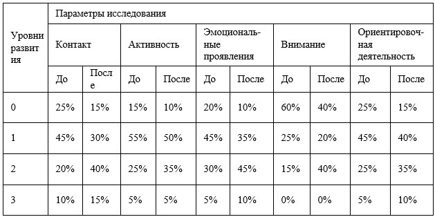 у 75% детей экспериментальной группы отсутствует, либо слабо выражен контакт и эмоциональные проявления;