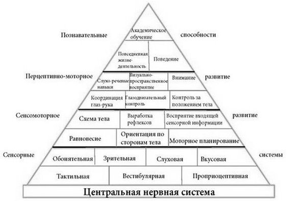 Как уже отмечалось выше, данная схема хорошо иллюстрирует направление развития «снизу-вверх»: от базовых, врожденных, «телесных» функций до социальных конструкций, что легло в основу формулировки принципов метода нейросенсомоторной интеграции:
