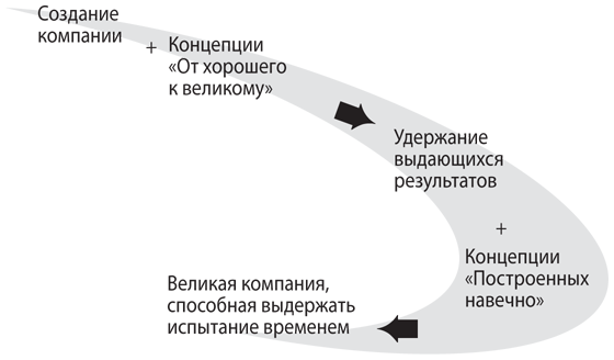 От «От хорошего к великому» к «Построенным навечно». По некоей иронии теперь я рассматриваю «От хорошего к великому» не как продолжение «Построенных навечно», а скорее как ее преддверие. «От хорошего к великому» – книга о том, как превратить хорошую организацию в устойчиво развивающуюся. «Построенные навечно» – о том, как, взяв компанию с устойчивыми показателями, превратить ее в компанию, которая способна, поддерживая этот успех во времени, стать объектом для подражания. Для осуществления этого заключительного рывка необходимо, чтобы компания обладала ключевыми ценностями и смыслом, выходящим за пределы стремления к прибыли, и все это в сочетании с принципом «стимулируя прогресс, сохранять суть».