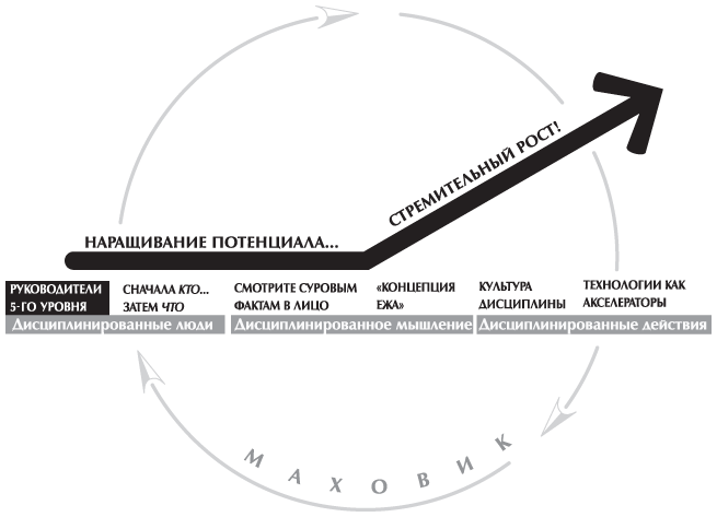 Маховик и порочный круг. Те, кто начинает революционные преобразования, масштабные программы реструктуризации и трансформации, определенно не смогут добиться выдающихся результатов. Какими бы ни были конечные цели, переход от хорошего к великому нельзя осуществить одним махом. Нет такого единственного шага, программы, инновационного внедрения, удачного преобразования или волшебного мгновения. Напротив, процесс напоминает вращение гигантского тяжелого маховика в одном направлении: медленно разгоняясь, он наконец достигает момента, когда накопленный потенциал начинает работать на вас и компания вступает в период стремительного роста.