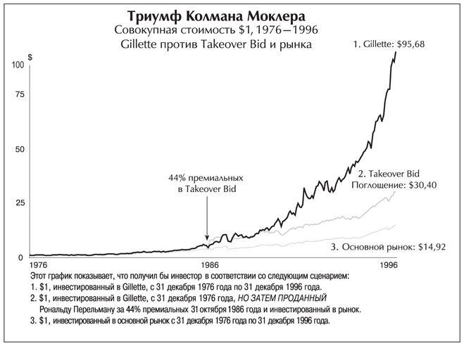 В конце концов Моклер и совет директоров доказали, что они правы. Если бы те, кто хотел продать акции, приняли 44 %-ную премию, предложенную Рональдом Перельманом 31 октября 1986 года, и затем инвестировали все эти деньги в рынок на десять лет до конца 1996-го, то их суммарная прибыль оказалась бы в три раза ниже, чем прибыль тех, кто инвестировал в Моклера и Gillette[40]. Действительно, если бы Моклер сдался «налетчикам», положив себе в карман миллионы долларов, это было бы против интересов компании, ее клиентов и ее акционеров.