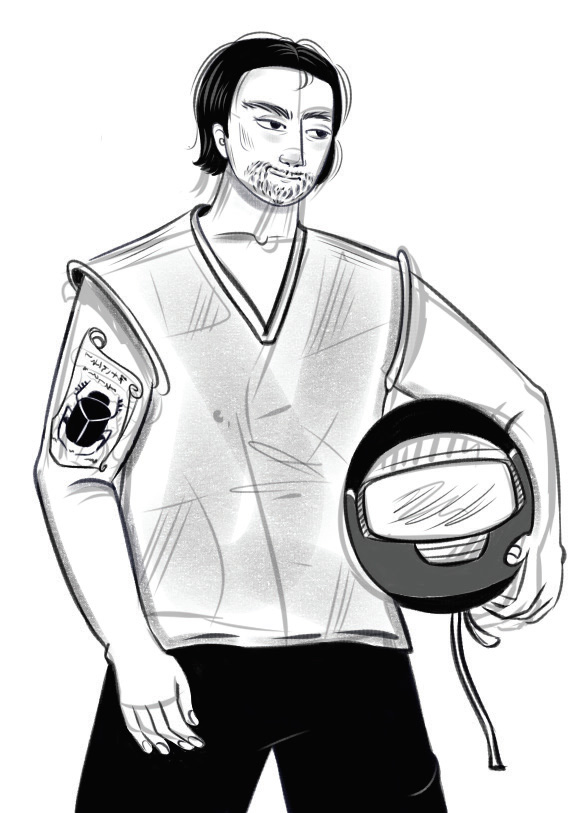 Вдруг ее взгляд поймал безликий человек на мотоцикле. Зыркнув в ее сторону, он попытался немного приблизиться к их машине. Испугавшись, что сейчас он заденет их, девушка отшатнулась, схватившись за переднее сиденье, но мужчина просто перестроился ближе к машине, продолжая ехать в параллель. Оценив дорогу впереди, голова в шлеме повернулась в сторону Аннетт. Она не видела его глаз, но точно знала, что он рассматривал ее. Мужчина помахал рукой, но на этот раз девушка не ответила, опасливо следя за каждым его движением. Их машина повернула налево, а мужчина проехал дальше вперед. Аннетт подскочила к заднему окну, проводив его взглядом. Мужчина был одет в потрепанную безрукавку зеленовато-песочного цвета из плотной ткани с разнообразными нашивками. На улице было достаточно жарко, даже душно, но ему, наверно, было хорошо: он может почувствовать кожей прохладу, которой в это лето очень не хватало. Однако, в ее сознание запал не сам образ мужчины, а немного выцветшая, но не потерявшая красок, татуировка от плеча до локтя. Это было нечто из древнего Египта: рассмотреть деталей она не успела, но в глаза ей бросился жук скарабей рядом со странными манускриптами и, как фоном, голубое небо. Этот рисунок был до боли знакомым, но Аннетт никак не могла вспомнить где же могла его видеть. Даже детство свое она вспоминала с трудом, а в подростковом возрасте она почти ни с кем не общалась, но среди ее немногочисленных знакомых точно не было никого с татуировками, тем более такими яркими.