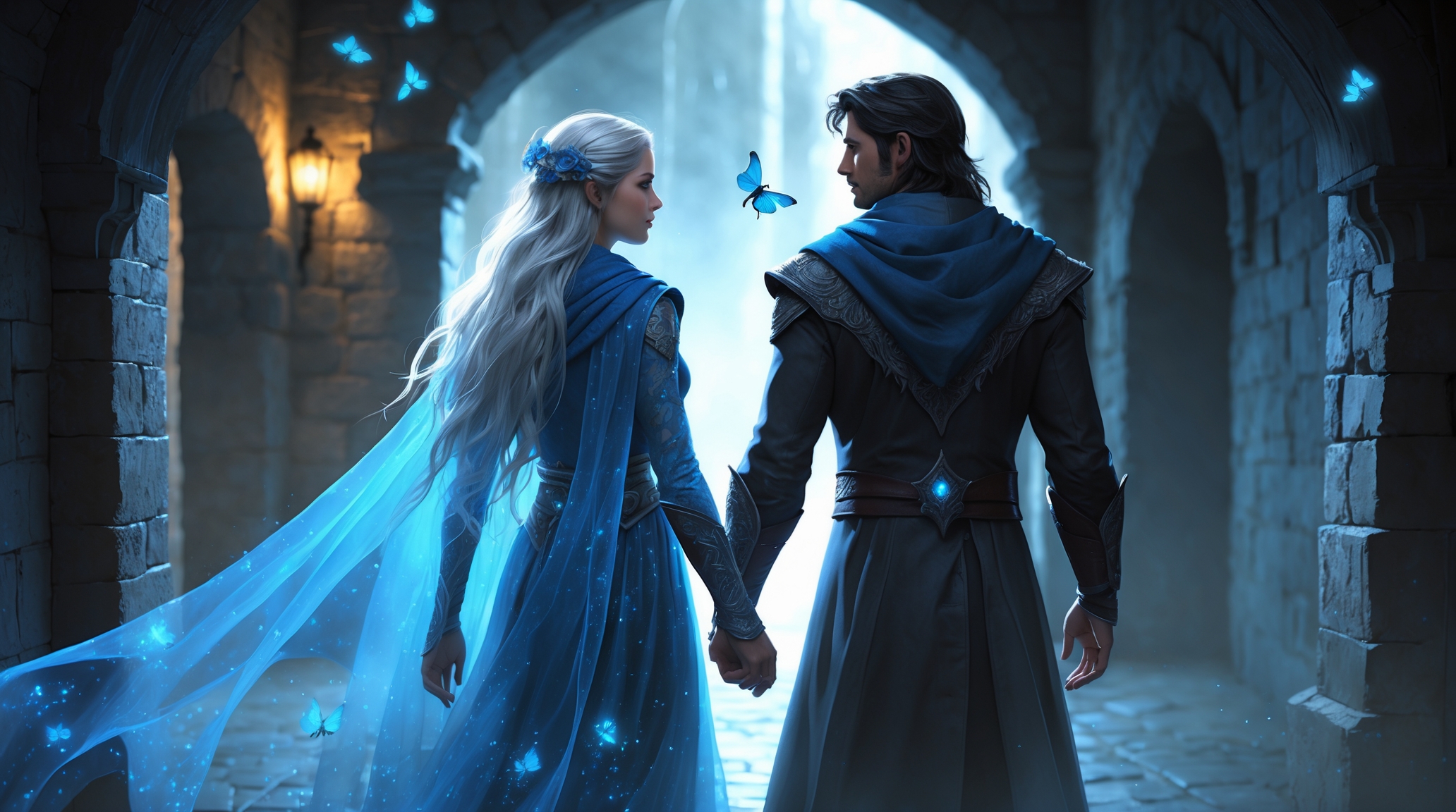 Мрачные стены древнего замка, казалось, дышали в такт шагам двух фигур, скользящих по тайному коридору. Синие светлячки, словно живые сапфиры, вились по камням, вспыхивая ярче при каждом прикосновении серебровласой девушки. Они узнавали её – последнюю из Хранителей Истока.
