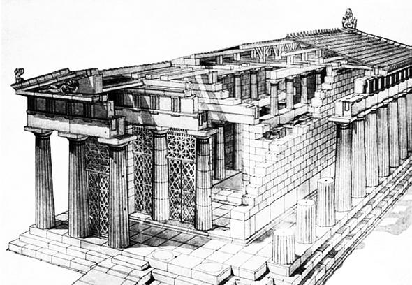 Под давлением новых мировоззрений, храмы перестали символизировать силу и авторитарность власти, но в качестве земной обители богов, превратились в место встреч и общения, как и подобает гостеприимному дому. Греки строили культовые сооружения по той же схеме, что и свои жилища: один или два прямоугольных объема, окруженных коллоннадой и перекрытых двускатной крышей (Рис. 1.20.) Созданный ими архитектурный образ, благодаря равновесию пропорций, функциональной чистоте конструкций и деталей, изысканности декора, естественно прорастающего в ткань архитектуры, оказался настолько жизнеспособным, что на протяжении всех последующих веков вдохновлял архитекторов на создание как культовых, так и светских зданий.