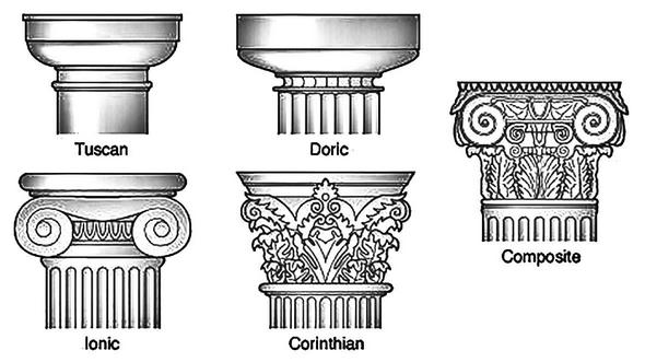 Дизайн каждого храма зависел от выбора типа колонн и соответствующей ему конструкции перекрытия. Каждый из трех изобретенных греками ордеров (Doric, Ionic, Corinthian) имел собственный рисунок капители, пропорции колонн и интерколлумния, детали орнаментации (Рис. 1.22.) и был назван по имени греческой провинции, где, в соответствии с легендой был применен впервые. Выбор ордера диктовался назначением объекта – мощный дорический (doric) ордер символизировал мужское начало и применялся в храмах, посвященных героям и мужским божествам, стройные колонны ионического (ionic) ордера с элегантными эволютами капителей олицетворяли женственность и использовались в храмах богинь. Впоследствии Римляне добавили в архитектурную палитру два своих ордера – тосканский (Tuscan), названный в честь Тосканы, и комбинацию ионического и коринфского – композитный (Composite).