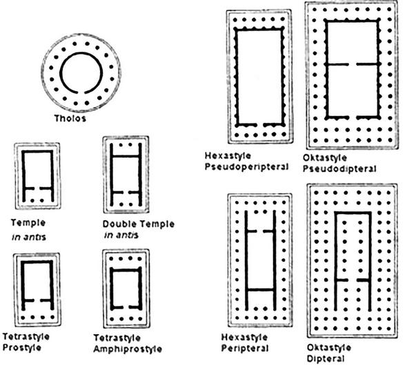 Важнейшим архитектурным элементом любого греческого храма, независимо от его типа (Рис. 1.23.), является колоннада. Помимо конструктивной и эстетической нагрузки, она участвует в формировании уникальной среды, создаваемой пространством интерколлумния. Своеобразие подобного пространства во многом объясняется его экологическим и социальным предназначением – служить шлюзом между внутренней средой архитектурного объекта и окружающим миром, а также между формальными отношениями, приличествующими храму, и свободным общением вне его пределов. Доступное в любое время для граждан республики, защищенное от непогоды, это пространство было излюбленным местом обсуждения социальных и научных проблем, спортивных новостей – всего, что составляло жизнь демократического государства.