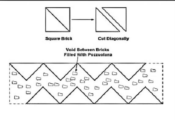 Римская кирпичная стена (Рис. 1.24.) явилась первым примером работы с опалубкой. Квадратные кирпичи разбивались по диагонали и укладывались стороной раскола наружу, формируя лицевую поверхность стены. Затем работа повторялась для ее другой поверхности, а промежуток заполнялся бетоном. Так, слой за слоем, стена могла расти практически до любой высоты. Опалубка не убиралась, так как являлась одновременно составной частью конструкции и архитектурного оформления стены. Гениально – правда?