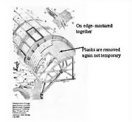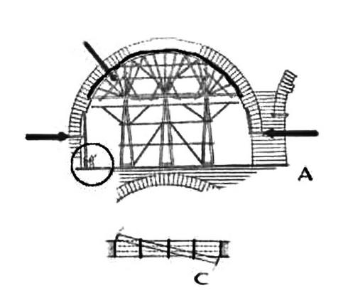 Последовательность процесса можно рассмотреть на Рис. 1.26. Нижняя часть опалубки, поддерживающая конструкцию изнутри, с окончанием работ сдвигалась относительно вертикальной оси (Рис. 1.27.) и убиралась для последующего использования, наружная ее часть, состоящая из кирпичных кессонов, оставалась частью перекрытия.