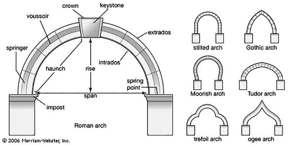 Несмотря на то, что описанные строительные технологии позволяли строить арки любых очертаний, что и делалось впоследствии (Рис. 1.28.), римляне придерживались полуциркульной формы. Ее многочисленные производные – купола, апсиды, своды, наряду с архитектурными ордерами и заимствованными из древних цивилизаций правилами строительной геометрии – двухосевой симметрией и модульными пропорциями, легли в основу того, что мы сейчас называем Классическим языком архитектуры.