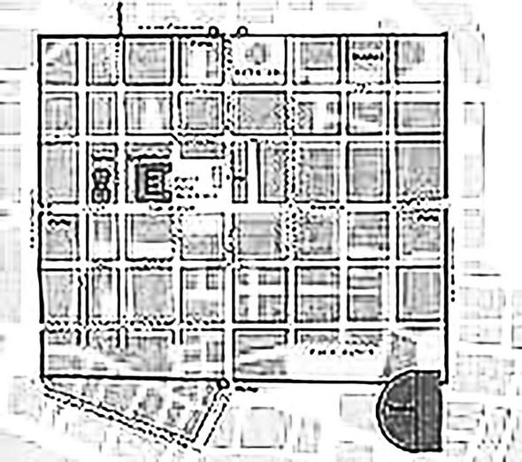 Движимые желанием утвердить свое господство на захваченных землях, к тому же не всегда располагая временем для изучения местных топографических условий, римляне строили свои города, используя ориентированную по сторонам света ортогональную сетку, попирая ландшафт с той же жестокостью, что и восстания рабов. Проложенные с севера на юг и с запада на восток главные улицы города образовывали в месте пересечения площадь, вокруг которой размещались основные общественные здания, и, пройдя сквозь ворота окружающей город оборонительной стены, продолжались как дороги до следующего форпоста (Рис. 1.31.). Земли вокруг города нарезались на квадраты со стороной 728 метров (2400 футов) для поместных владений.