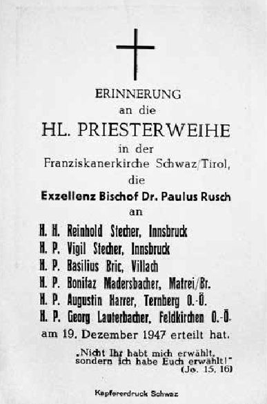Sein erstes Messopfer feierte Reinhold Stecher am Christtag 1947 in der Pfarrkirche Wilten, einen Tag nach seinem Bruder, der wiederum seine Primiz als Christmette in der Hofkirche von Innsbruck zelebrierte – der eine dem anderen jeweils als Konzelebrant beigestellt.