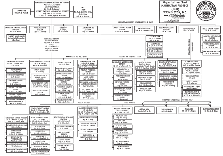 Организационная схема проекта «Манхэттен» (на английском) по состоянию на 1 мая 1946 года